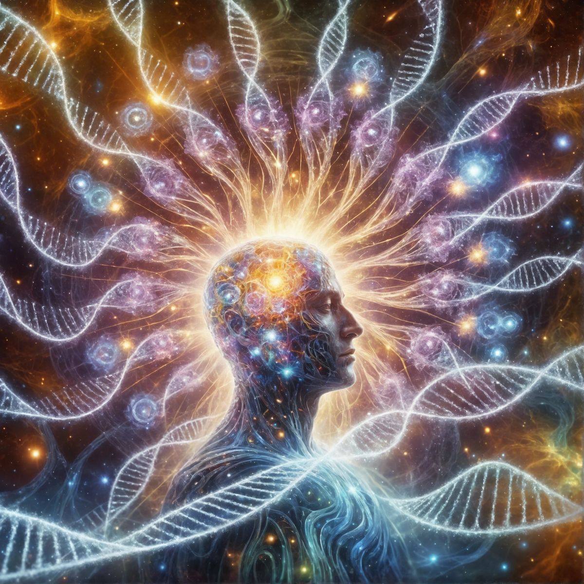 This image shows a divine entity taking human form from a network of DNA strands. The double helix glows with supernatural charm against a cosmic backdrop, in a surreal style.