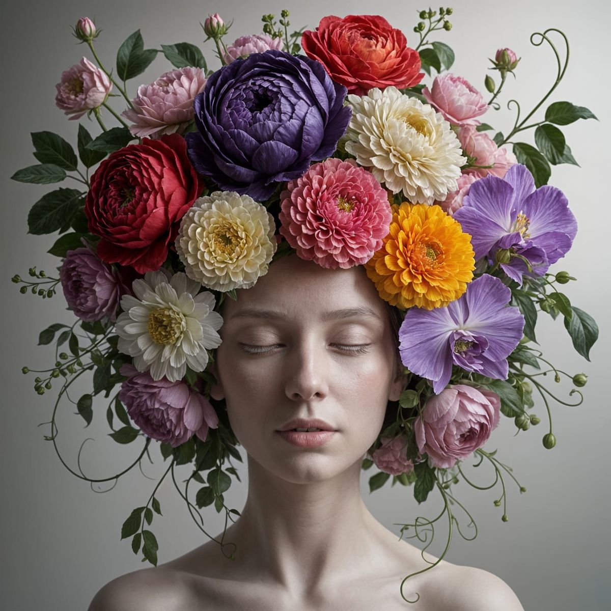 A captivating image showing a serene woman with porcelain skin and closed eyes, adorned with an elaborate floral crown. The arrangement features roses, peonies, marigolds and orchids, illuminated in a golden-hour style.