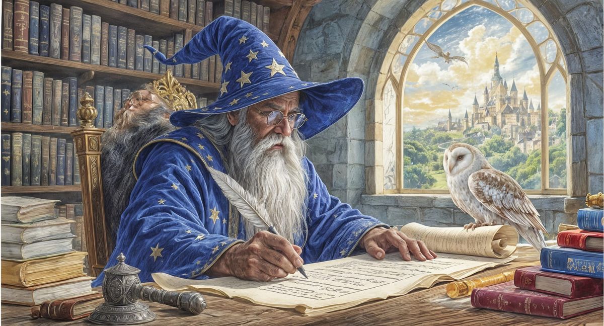 This image shows a kindly old wizard engrossed in writing. He is in a medieval office filled with books and scrolls, with a white owl and a distant fantasy kingdom visible through a window.