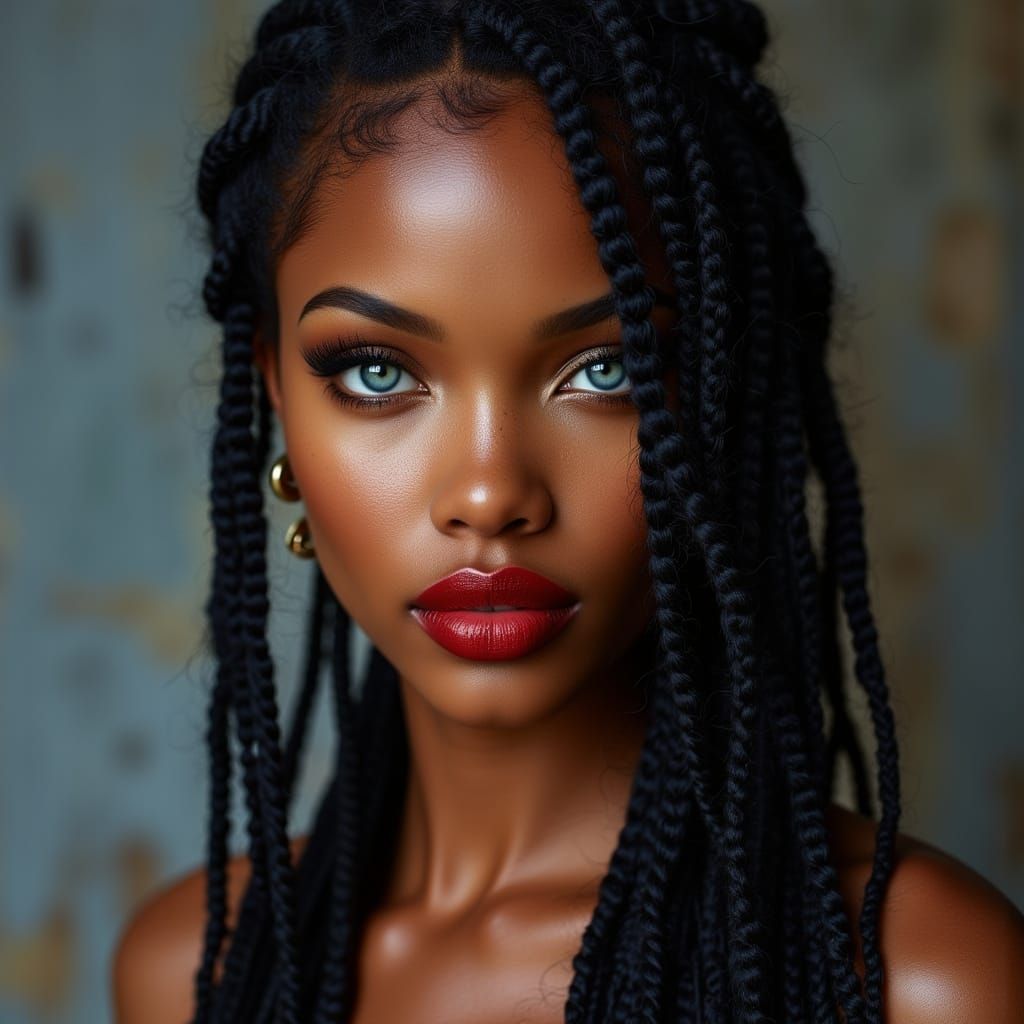 This striking studio photograph features Kelly Rowland as a blue-eyed warrior goddess with braided hair and red lipstick. The image is styled realistically, akin to high-fashion magazine photography.