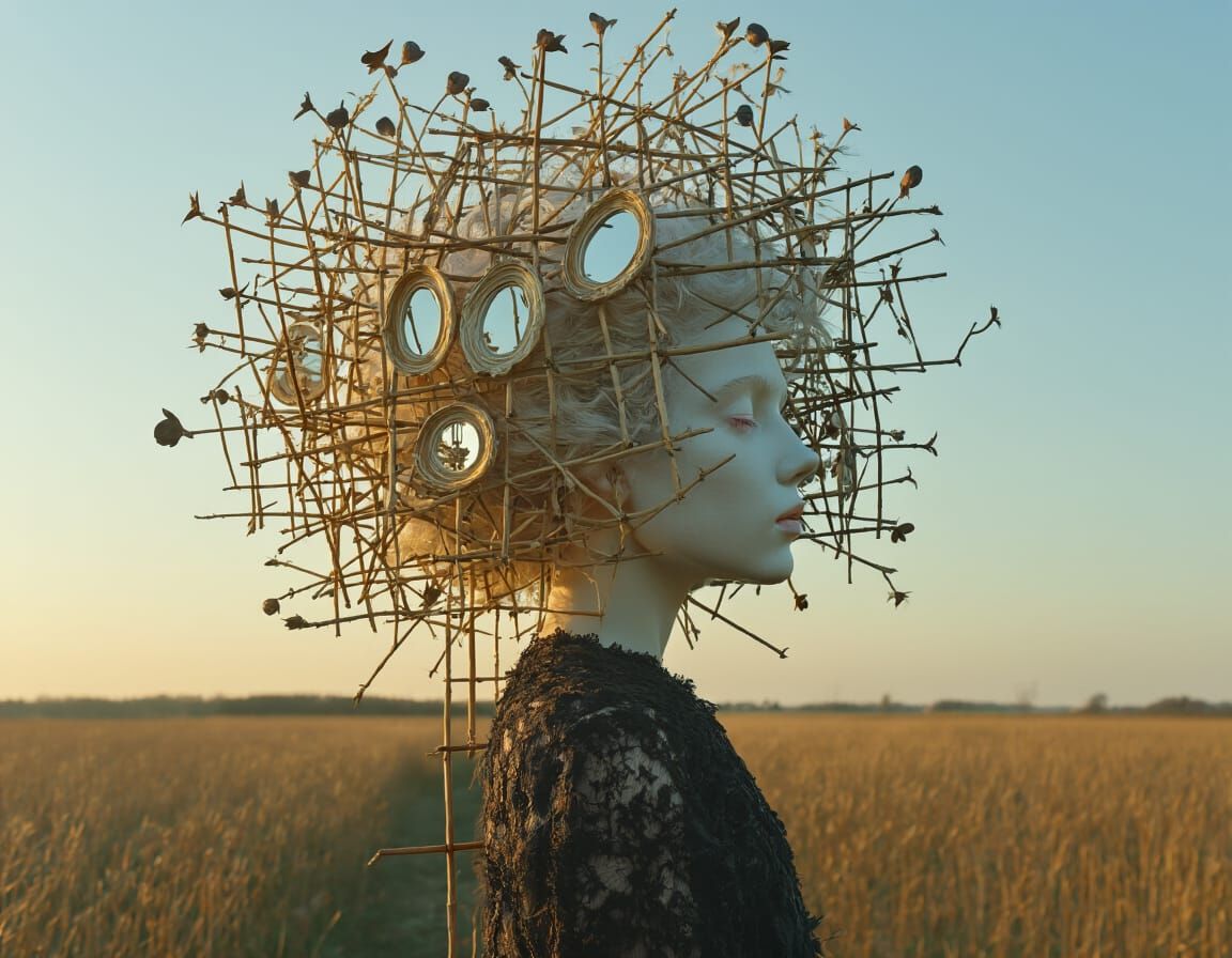 she's hollow mirrors on nature mock her embodied ivory-white hair like scaffolding holds a series of recursive wild mirrors climbing up and around her bunched hair-strands in layered hollowness reflecting the futility of right now pull back into a wide angle wild angle full-length long shot mirroring ...