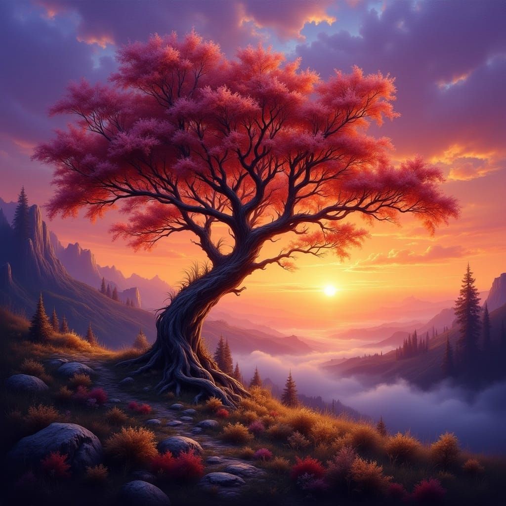 This image shows a solitary ancient tree reaching towards a spectacular sunrise. The fantasy landscape features rich, deep colors and far vistas, painted with detailed brushwork in an impasto style.