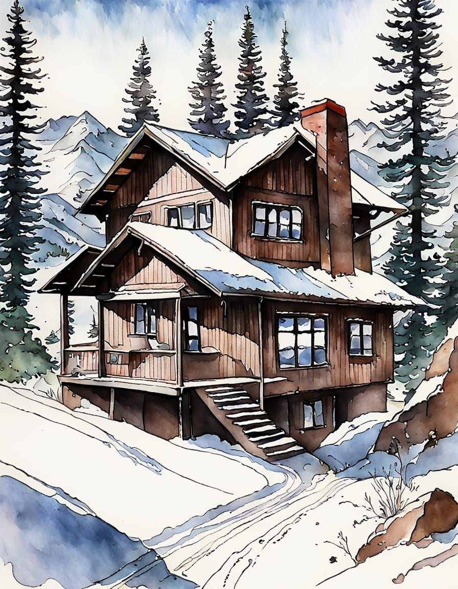 This image shows a charming ski chalet in the Colorado mountains, depicted in a simple yet elegant ink and watercolor style.