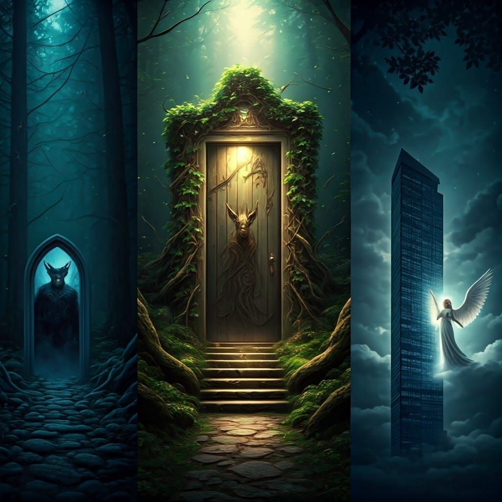 A lone, vine-covered mystical door stands in a forest revealing a woodland king. Cinematic lighting and film grain create a sense of wonder in this image.
