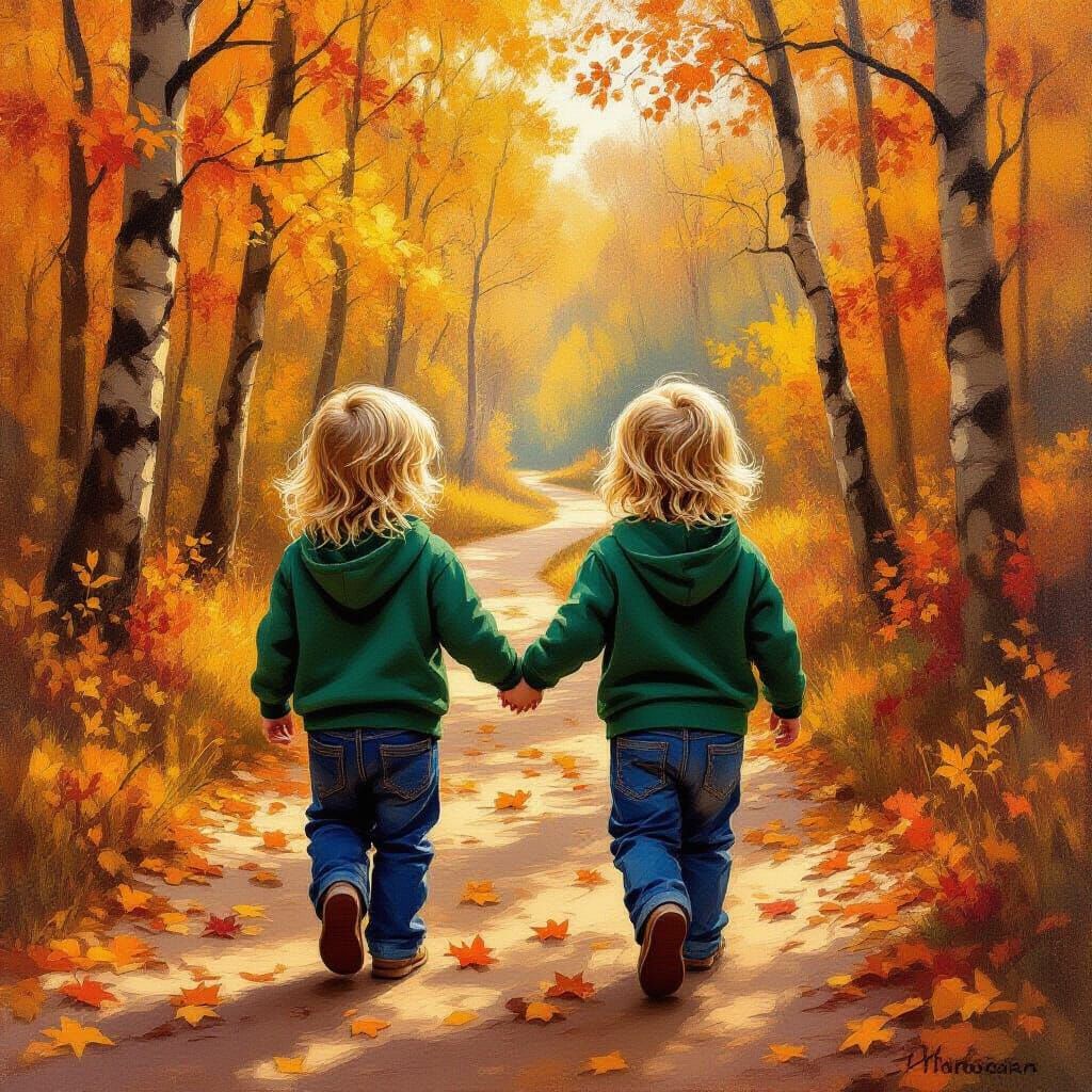 This image shows two young twin boys walking hand-in-hand on a forest path covered in autumn leaves. Rendered in an impressionist oil painting style with visible brushstrokes and rich texture, it evokes a magical fall atmosphere.