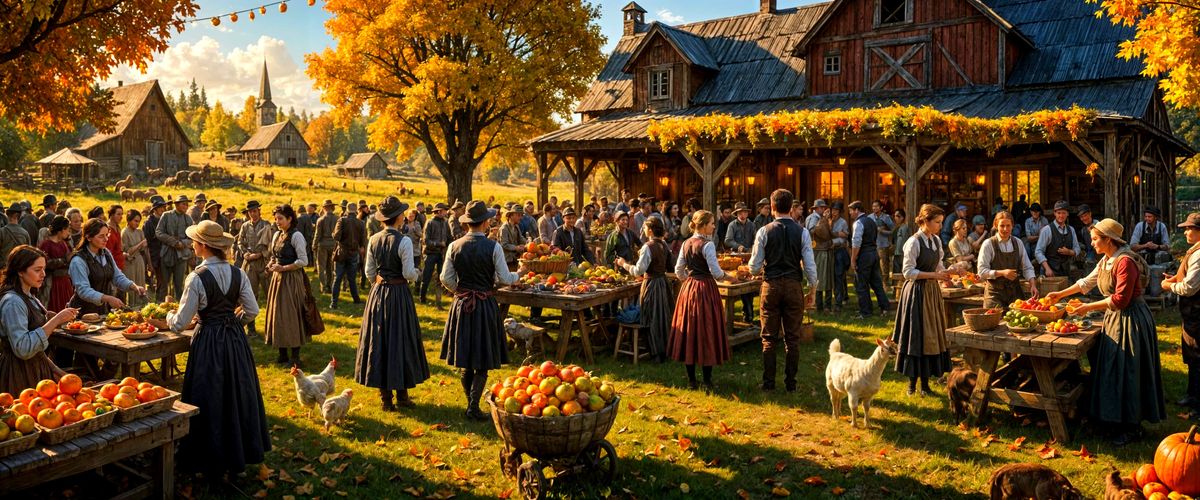 This image depicts a vibrant autumn harvest festival outside a barn. It features cheerful dancing, abundant food, farm animals, and a warm sunset, rendered with intricate detail and dynamic lighting.