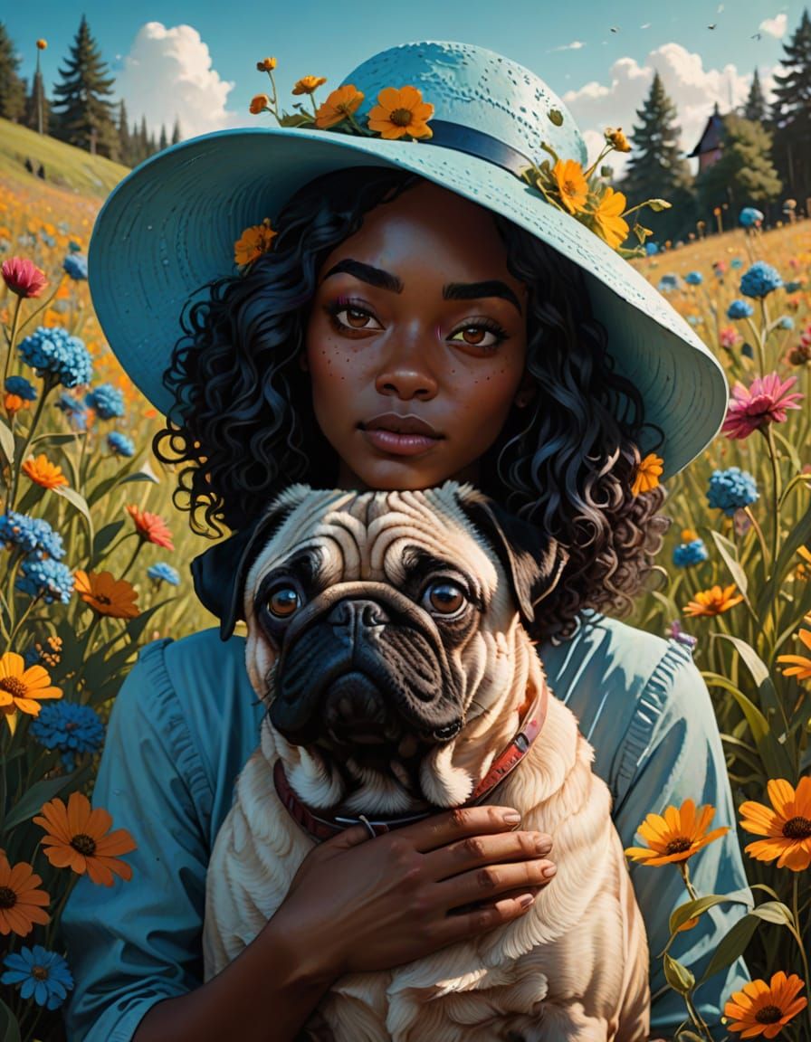 This vibrant portrait depicts a dreamlike scene of a black woman embracing a curly-haired pug, set amidst a whimsical backdrop of wildflowers. The image features a cinematic film still aesthetic with contrasting textures and soft focus, evoking a sense of warmth and intimacy.