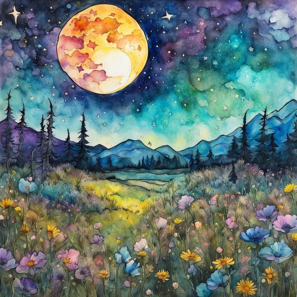 This image shows a vibrant, bioluminescent meadow filled with wildflowers beneath a mysterious moon and glowing stars. The artwork is reminiscent of dry-on-dry watercolor and alcohol ink techniques.