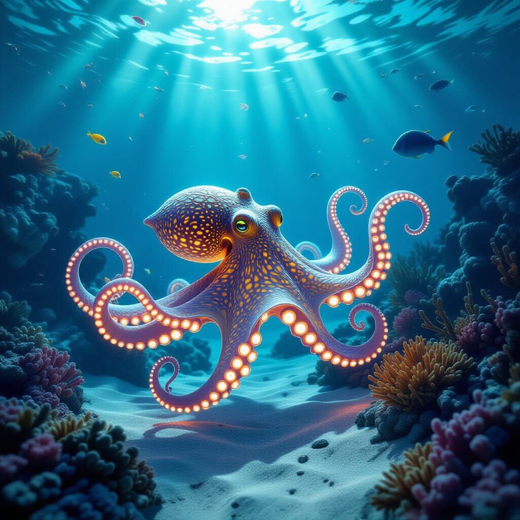 A vibrant image displays a bioluminescent octopus swimming in an alien ocean. Ethereal light illuminates the coral reef and bizarre lifeforms in this dreamlike digital art.