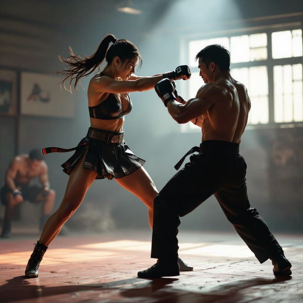 This image depicts a fierce female fighter in a short skirt delivering a decisive blow to a male opponent in a dimly lit dojo. Rendered in a hyperrealistic, cinematic style with vivid, contrasting colors.