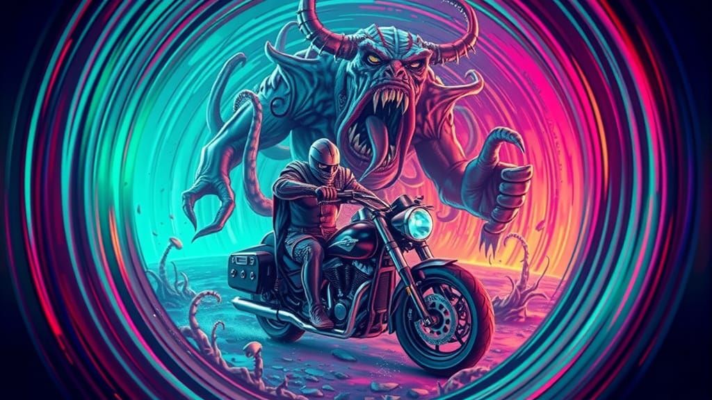 This image depicts a knight swordsman on a motorcycle, illuminated by ultraviolet fluorescent colors, charging towards a terrifying swamp monster with tentacles. The scene features a dynamic spin blur and oblique fisheye lens effect.