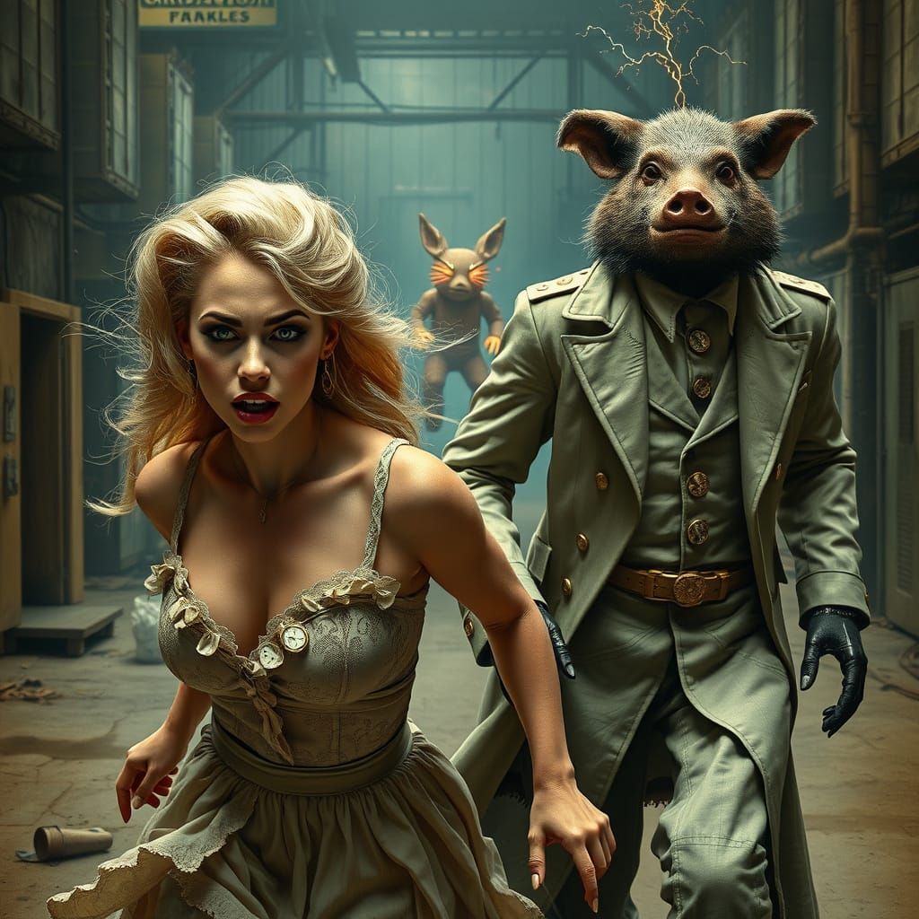 A dramatic scene of a woman and her wild boar husband fleeing through a desolate industrial zone, amidst sparks and electric chaos, with a gingerbread man frozen in place in the background, in a dark, industrial, and biomechanical aesthetic reminiscent of H.R. Giger and Tim Burton
