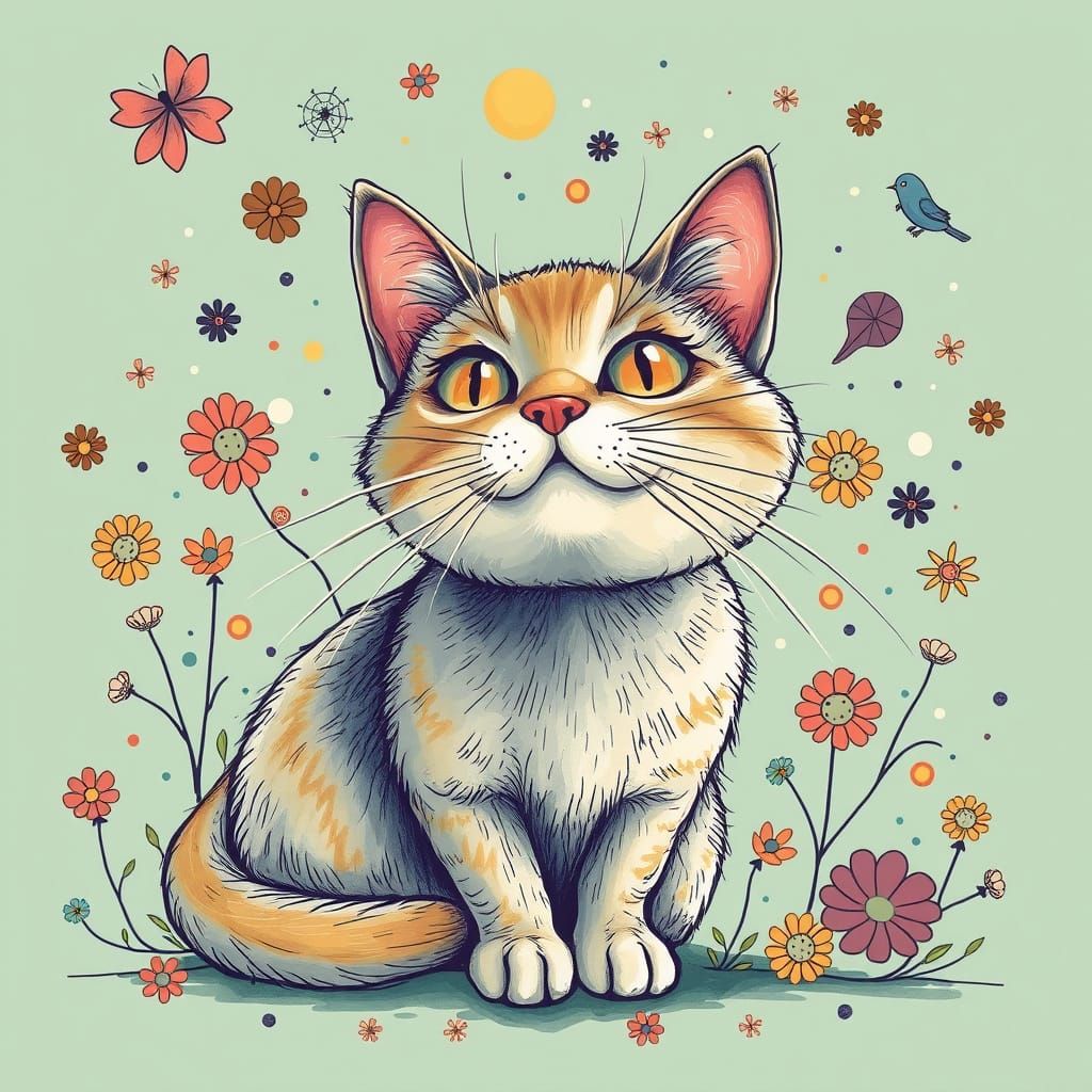 This image showcases a highly detailed, whimsical cat illustration. It features a playful dynamic composition with abstract, bizarre background elements and surreal decorative touches in a vibrant color palette.