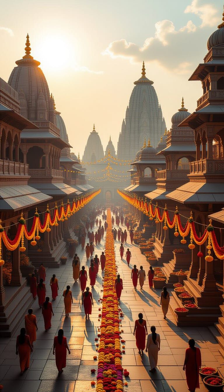 This image captures a vibrant cinematic scene of Ayodhya city adorned with diyas and flowers. Ancient temples glow in warm sunlight, reflecting a mood of spiritual joy and festivity with luminous detail.