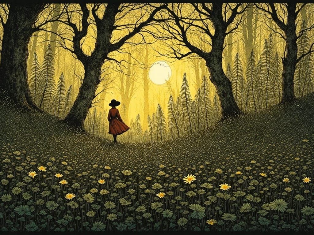 A woman walks through a misty forest with ferns covered in glistening dewdrops. The image is reminiscent of a detailed wood engraving, with delicate lines and intricate textures.