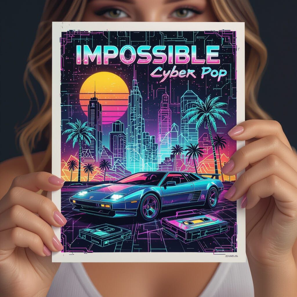 This image shows a woman holding a flash tattoo sheet with neon glowing tattoo stencils. The cyberpunk City Pop design features holographic gradients and retro 80s elements with digital glitch effects in a futuristic aesthetic.