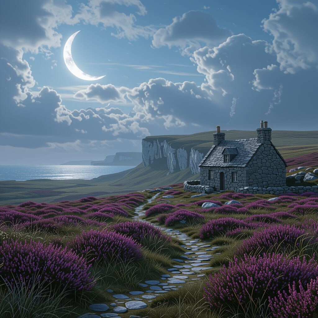 This detailed matte painting depicts a windswept moorland with a chalky cliff, heather in bloom, and a stone cottage under a large sky and crescent moon. Rendered in deep, complementary colors with intricate detail.