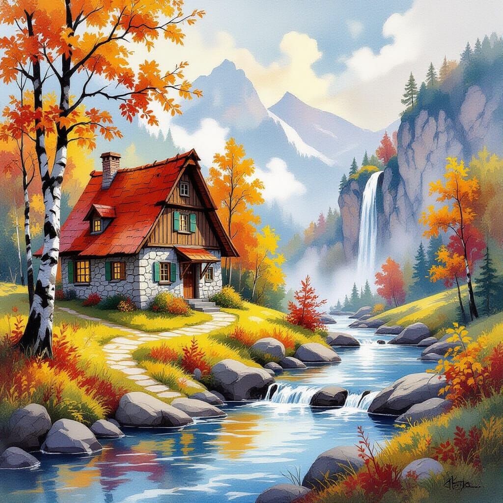 This image displays a quaint wooden cottage with a red roof, set in a vibrant autumn landscape. Features include golden falling leaves, a cascading waterfall, and a flowing river with drifting leaves, all rendered in a loose watercolor style.