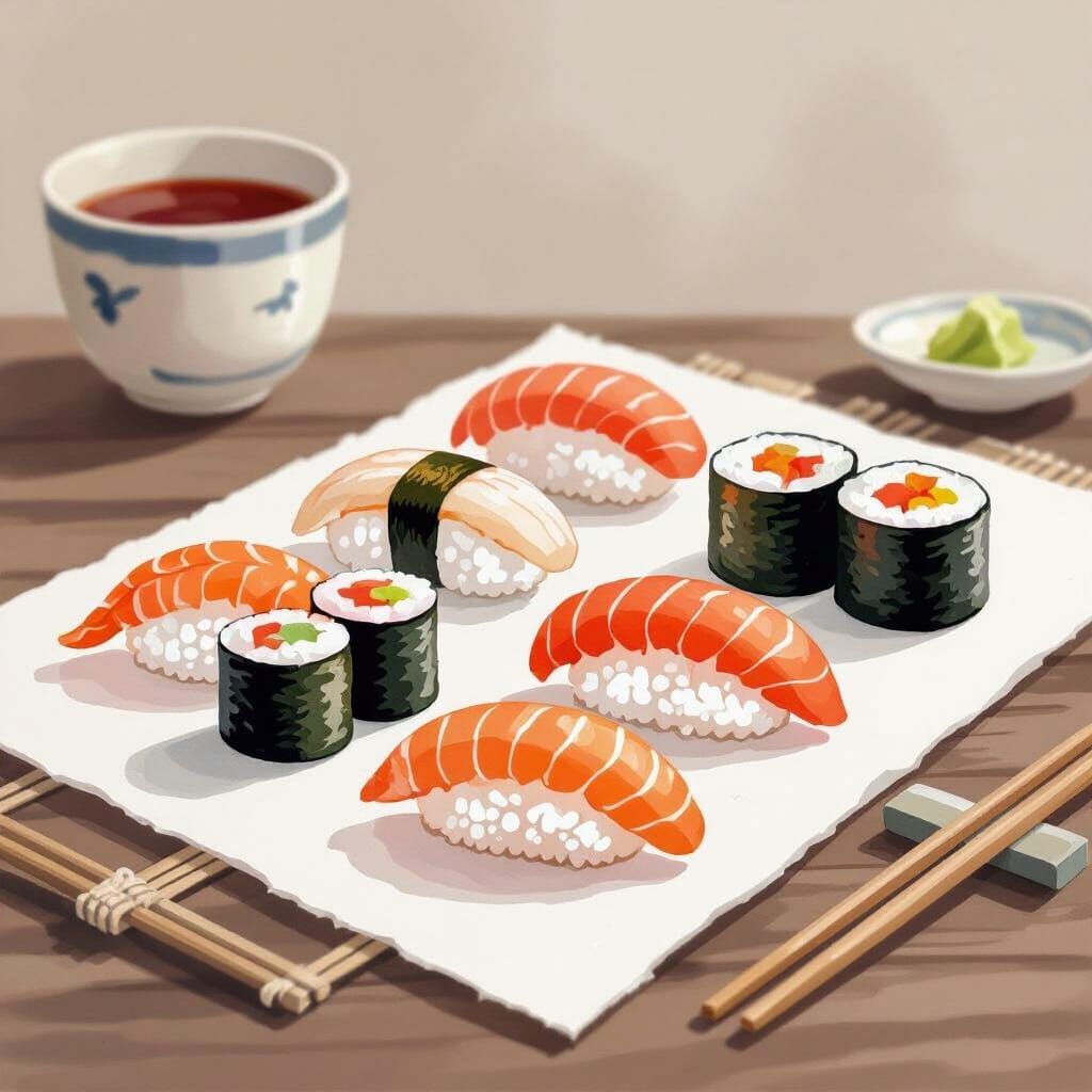 This image features a minimalist watercolor illustration of sushi on textured paper, using soft pastel tones and delicate brushstrokes. It's presented in a clean Japandi aesthetic, ideal for food posters or kitchen decor.
