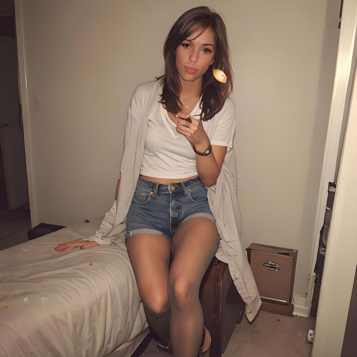 An image of a woman smoking after dinner. She is wearing tight jean shorts and pantyhose. The image is reminiscent of vintage photography.