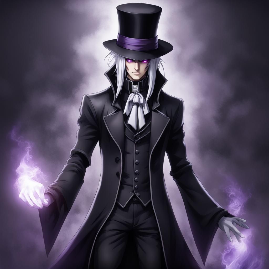 A realistic image of the Undertaker, a butler with white hair and glowing purple eyes. He is wearing a black duster and hat in this full height portrait.
