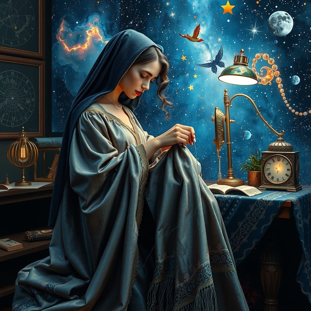 This image shows a seamstress in a nebula workshop, creating constellations. The scene is rich with volumetric lighting and colors, reminiscent of Art Nouveau and digital painting, with detailed ornamentation.