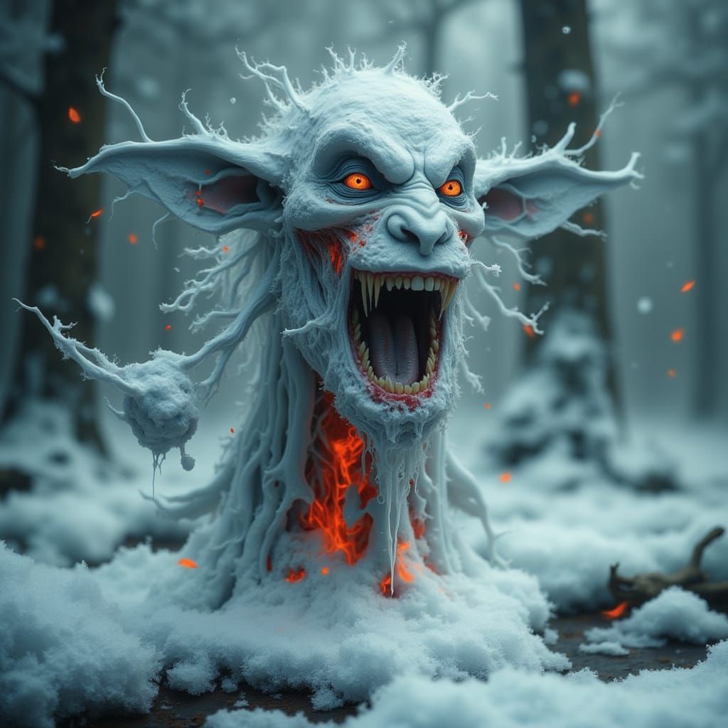 This image depicts an angry snow creature in a chilling winter biome, rendered with stark, contrasting colors for a horror aesthetic.