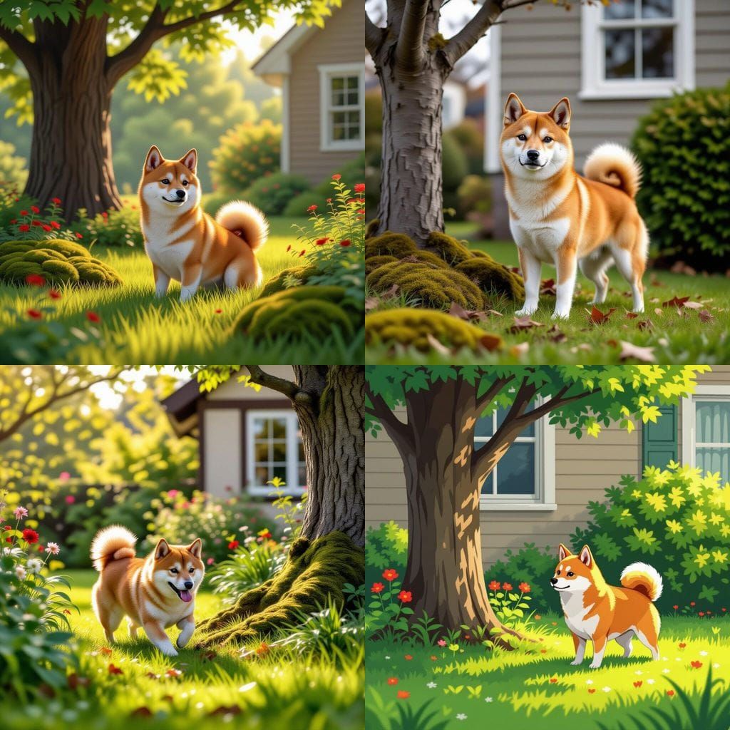 This image shows a Shiba Inu dog in a realistic outdoor setting. The scene includes a house, trees, grass, and other plants, creating a natural and detailed photo backdrop.