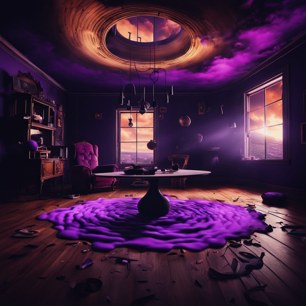 A surreal living room scene with furniture disappearing into a black hole. The artwork features warped floors and distorted silhouettes, accented by swirling cosmic clouds in a surrealist style.