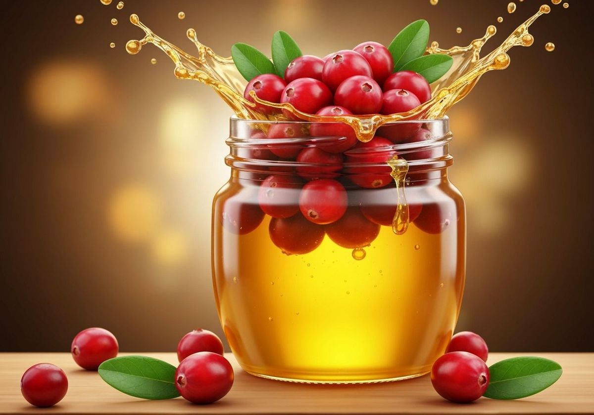 This photorealistic image shows a glass jar overflowing with golden honey, fresh cranberries, and green leaves. Ingredients splash dynamically against a blurred, warm background.