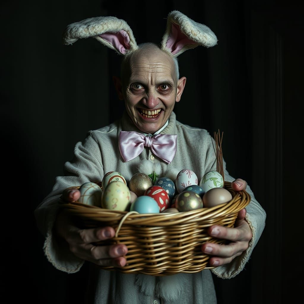 This haunting image features a disheveled Easter bunny figure, dressed in a tattered costume, offering a wicker basket filled with intricately decorated Easter eggs in a dimly lit, eerie atmosphere, evoking a sense of unease and tension.