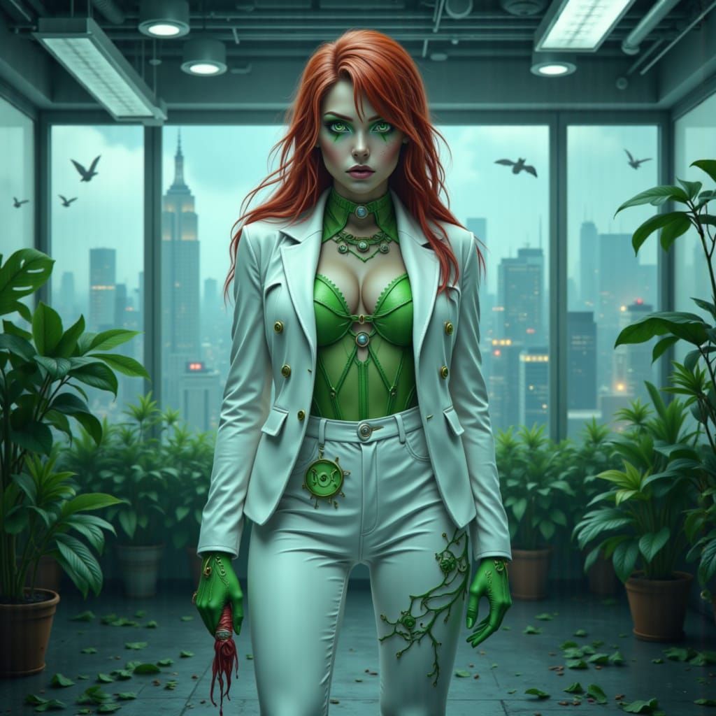 This digital art hyperrealistic concept art shows a gender-bent Poison Ivy in a white business suit within a New York City office, with dramatic lighting and vivid green accents.