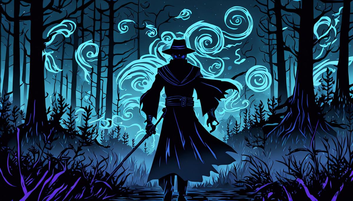 This dark fantasy image depicts a phantom in all black, standing in a misty pine swamp with energy swirling around him. His glowing blue eyes pierce through the darkness, surrounded by a moody atmosphere and deep blues and purples. The scene is reminiscent of Studio Trigger's style, with vibrant shading ...