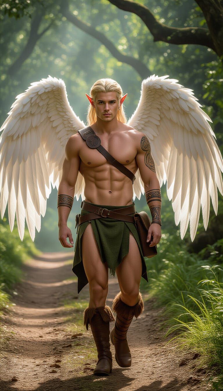 This image showcases a powerful male angel with blonde hair and white wings on a forest path. Rendered with cinematic lighting and a rich, earthy palette, it evokes a fantasy art style.