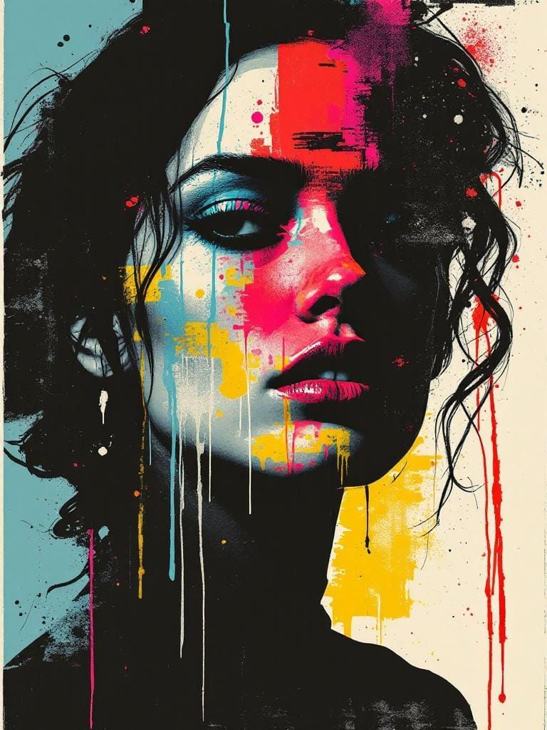 A striking picture of a standing woman in a classroom setting. This image combines high-contrast stencils, asymmetrical layouts, and neo-pop collage elements to create a bold and dynamic composition.