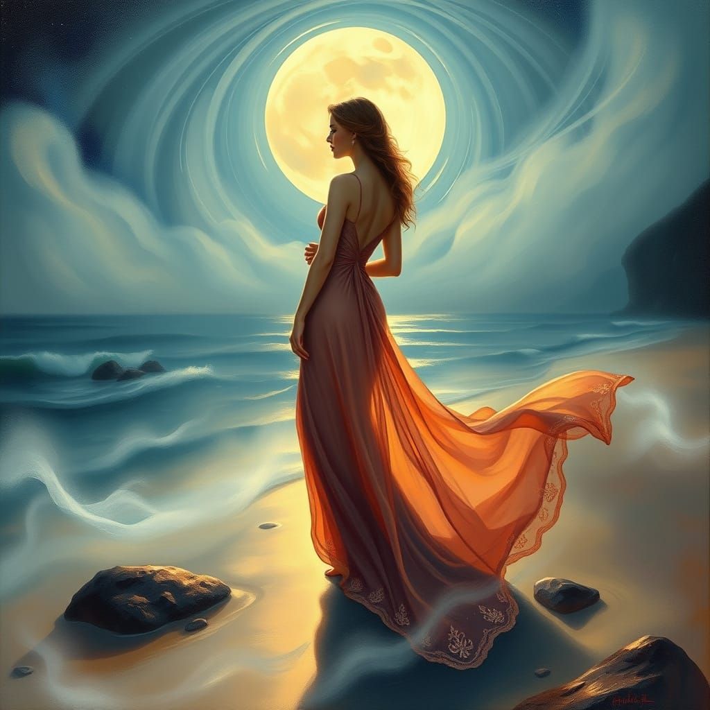 A captivating image of a woman in an elegant dress on a moonlit beach enveloped in swirling mist. The artwork showcases the flowing lines of Art Nouveau.