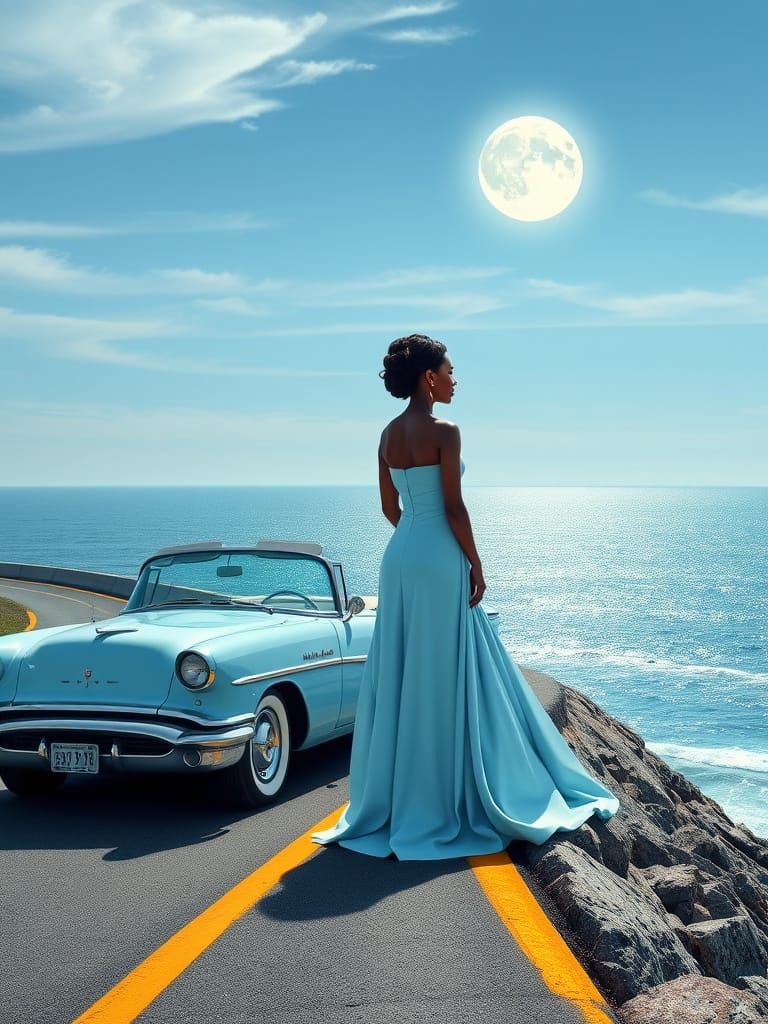 This image depicts a serene, romantic coastal landscape. A vintage powder blue Oldsmobile and an elegant Black woman in a matching gown stand by a shimmering ocean under a soft blue sky with a full moon.