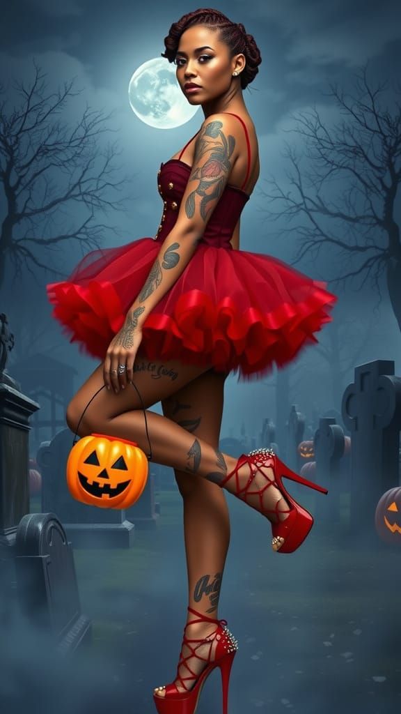 Ultra-photorealistic portrait of a woman in a red corset and tutu, with colorful tattoos, holding a jack-o'-lantern in a foggy cemetery at night. Cinematic lighting.