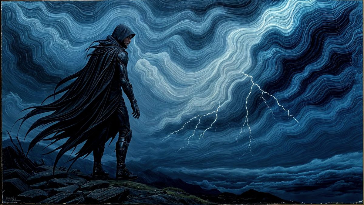 This image depicts a somber scene under a turbulent, stormy sky, evoking feelings of unease and melancholy. The artwork utilizes a disturbed painting aesthetic.