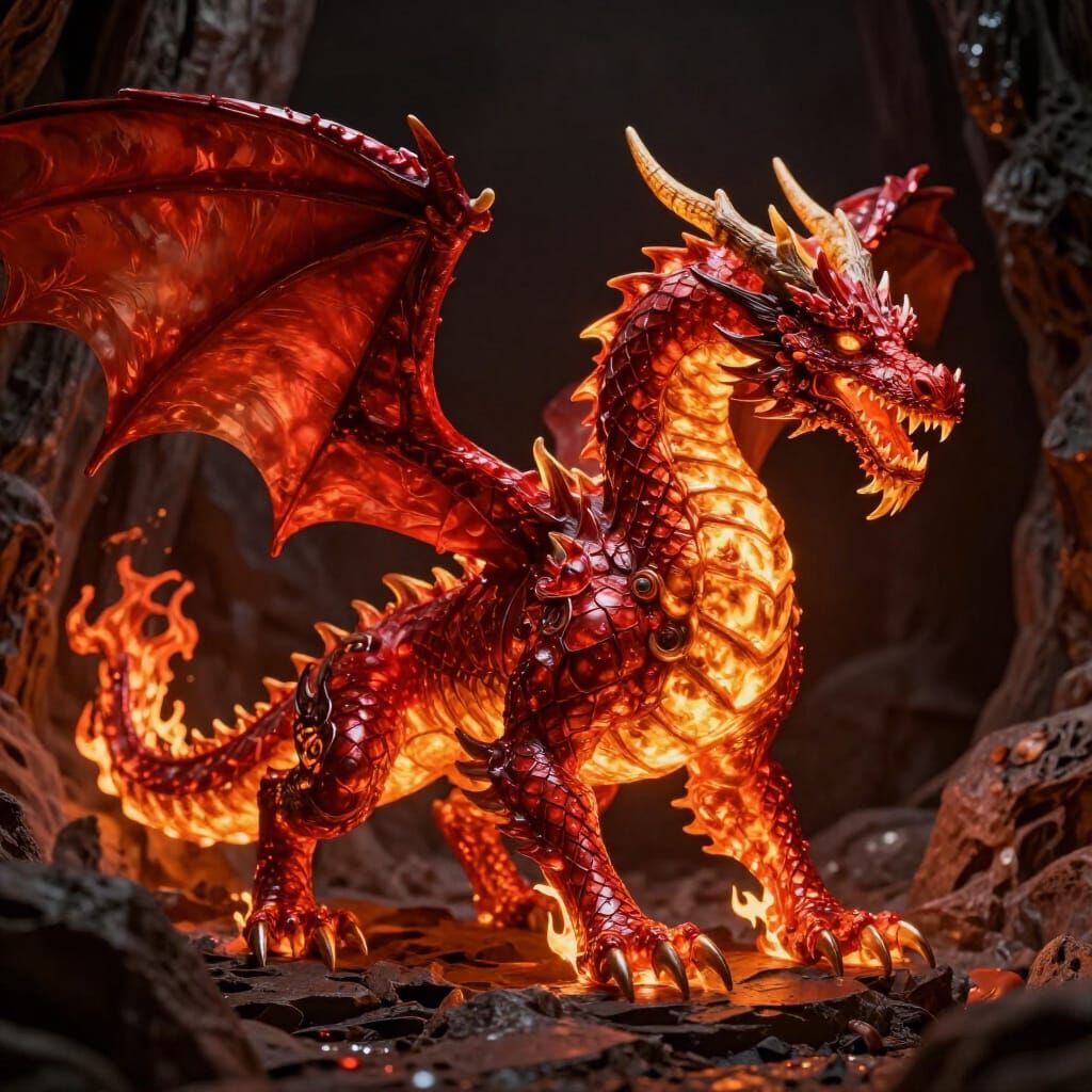 This image shows a magnificent red dragon with shimmering scales. Created in a vibrant digital art style, it features dynamic light and fiery colors on a dark volcanic background.