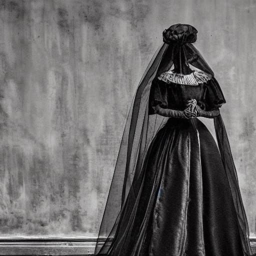 This image shows a spooky grayscale portrait of a figure in a Victorian mourning dress and veil, with a sense of blurred motion creating an eerie atmosphere.