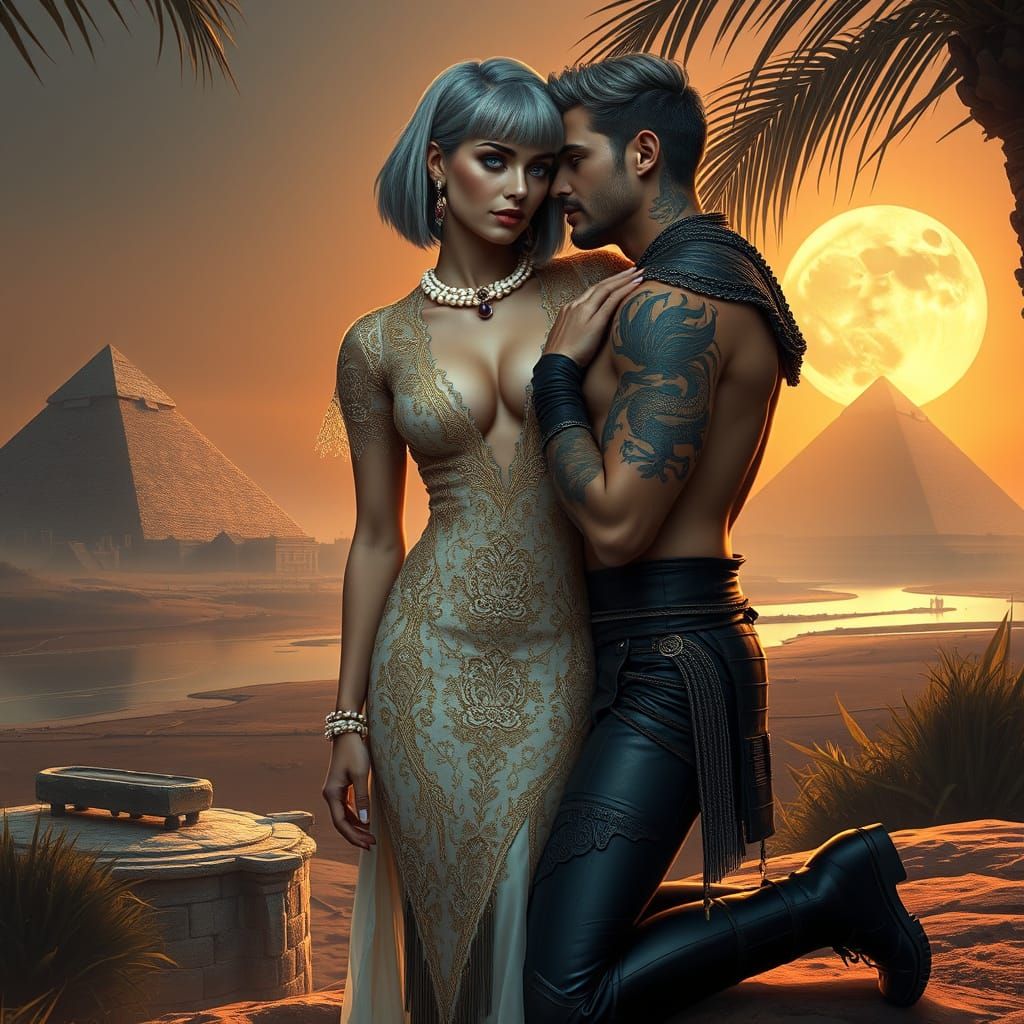 This captivating image depicts a majestic Egyptian goddess exuding mystery and allure, surrounded by the serene beauty of an oasis and the majestic pyramids, bathed in the soft glow of a full moon, as a devoted prince kneels before her in a scene reminiscent of dark, mystical realism.