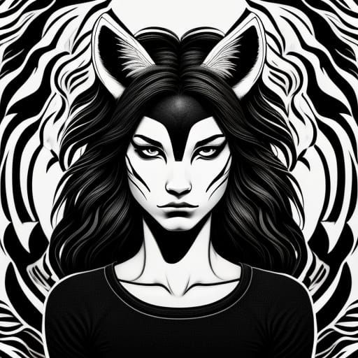 This image features a strong female figure with the spirit of a wild creature, blending human and animal attributes in a minimalist black and white art style.