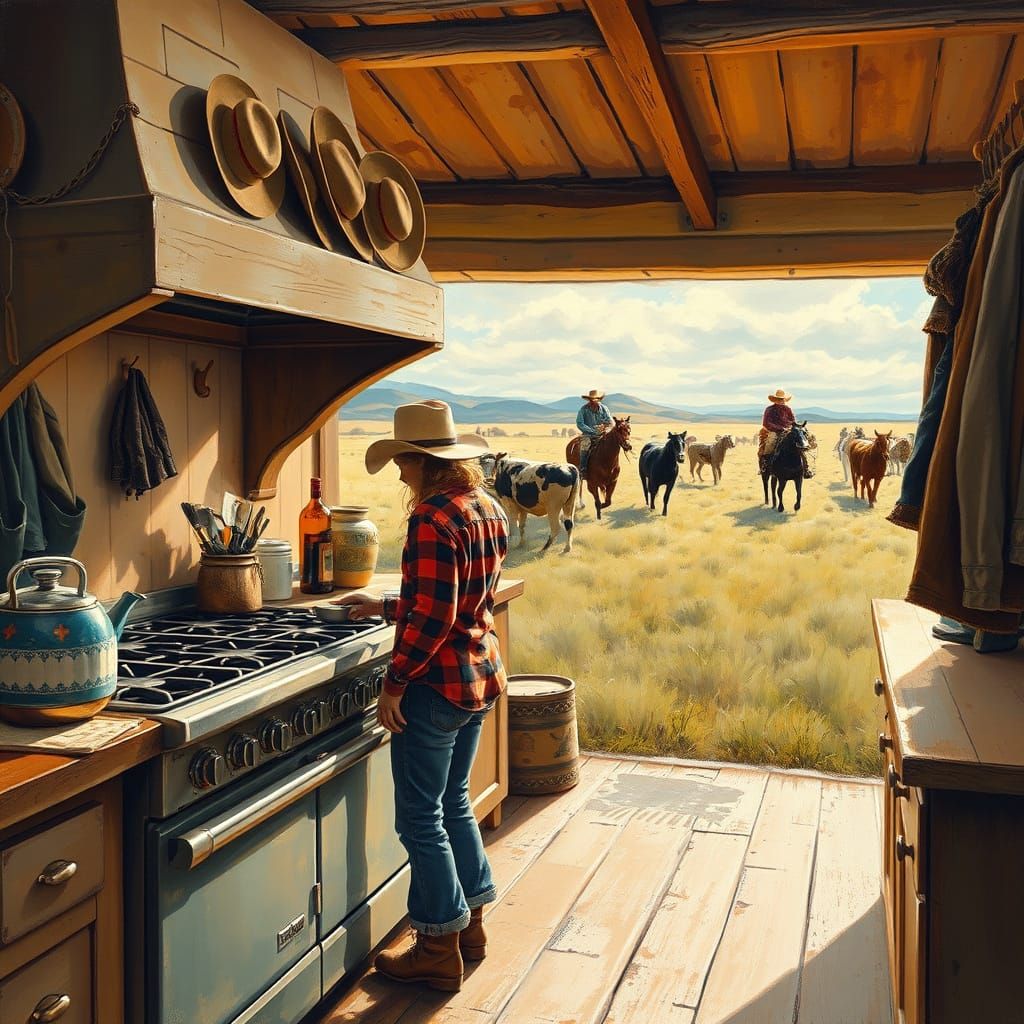 A cozy kitchen scene featuring a cowgirl cooking on a rustic range. Outside, cows graze in a field as cowboys ride horses in the distance, rendered with realistic and impressionistic brushstrokes.
