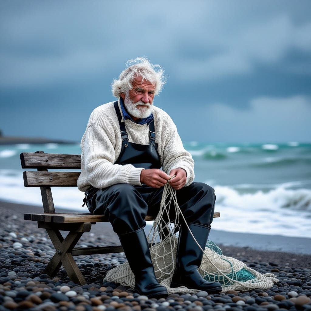 A weathered fisherman mends his net on a pebbled beach as a storm approaches. The image captures a dramatic, realistic scene with intricate textures and vibrant energy.