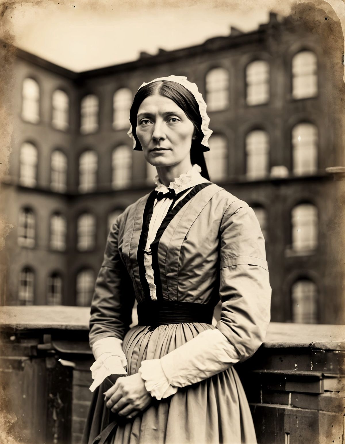 This image shows Florence Nightingale in a vintage black and white photograph. The background depicts an old hospital setting, rendered with the aesthetic of aged photography.