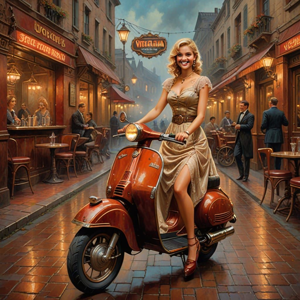 A full view of a smiling blonde woman in an elegant dress with a red Vespa in a vintage Italian cafe. The scene is depicted as a warm and detailed vintage oil painting with a soft, dreamy atmosphere.