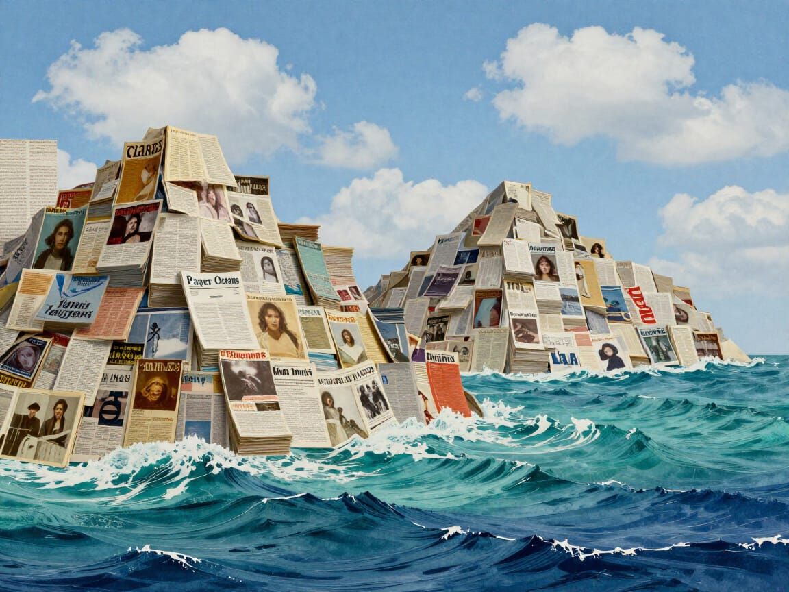 A surreal digital collage depicting βPaper Oceansβ gently lapping against towering βMagazine Mountainsβ. The mountains are constructed from stacks of vintage magazines with faded covers and bold typography, while the ocean is made of layered textured paper in shades of turquoise and deep blue. Above, ...