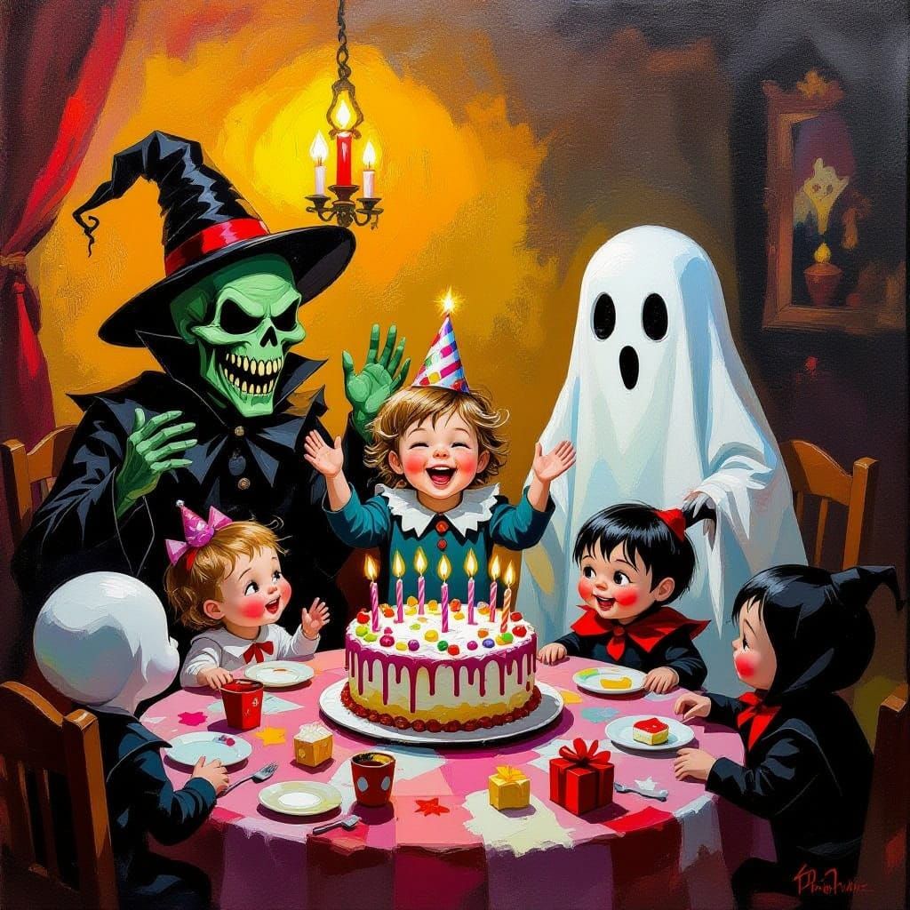 This image depicts a child's joyful birthday celebration with a ghoul, ghost, and Dracula kids in a decorated room. Rendered in a thick, textured oil painting style with rich colors.