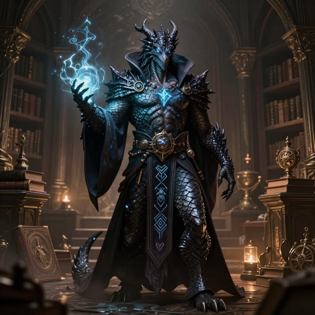 This image showcases a formidable dragonborn wizard with obsidian scales, radiating magical energy amidst forbidden tomes. Rendered in a dark fantasy concept art style with atmospheric lighting.